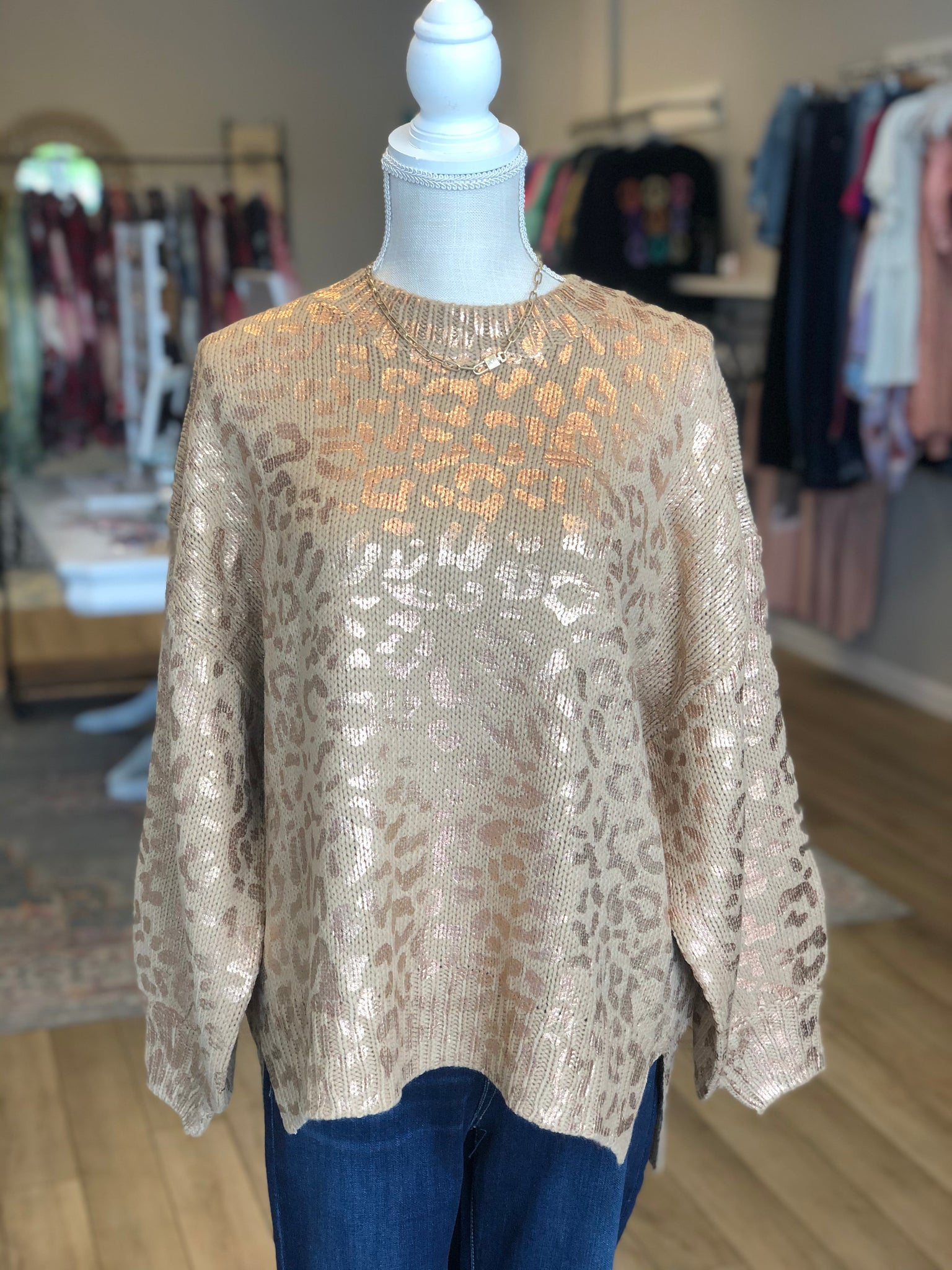 This taupe sweater has it ALL. The gold, metallic leopard detail and the balloon sleeves has us OBSESSED!