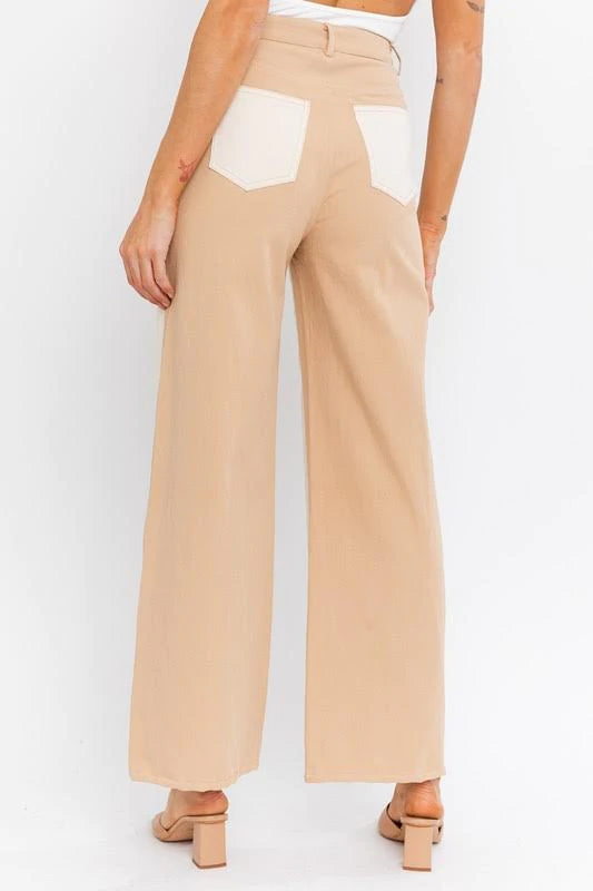 Twill Color-Block Pants featuring a high-rise fit and a relaxed straight leg. Color-block detailing on front and back. Zip fly and button closure.