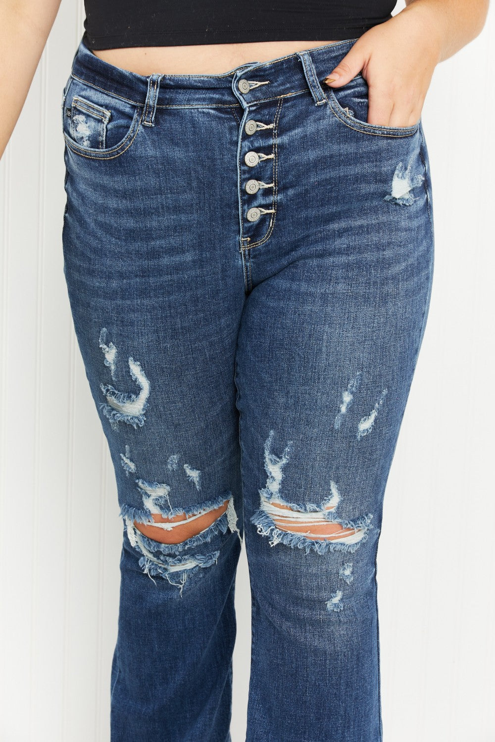 These flare jeans got an updated look with distressed details. The exposed button fly keeps them interesting and the flared leg creates the illusion of an hourglass shape. Wear these jeans to work with a dressy top or keep them casual with a graphic tee.